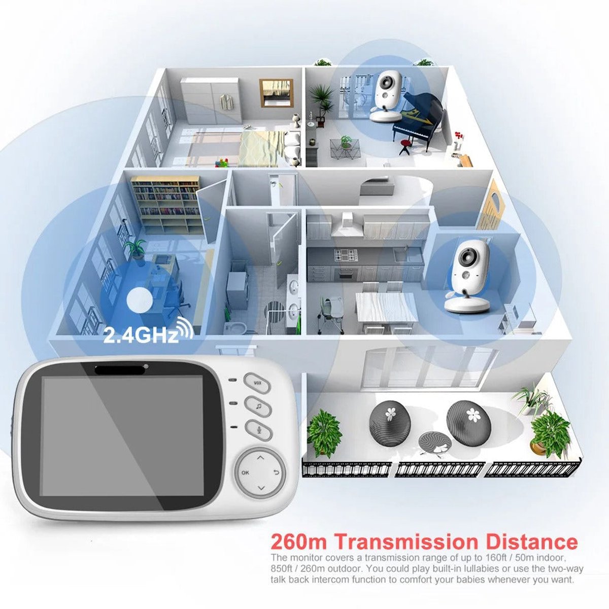 De babyfoon werkt op een 2.4G frequentie, wat resulteert in een stabiele en storingsvrije verbinding. Dankzij CMOS-technologie wordt de beeldkwaliteit geoptimaliseerd, terwijl het eenvoudige bedieningsinterface het gebruik moeiteloos maakt. Je hoeft geen technische expert te zijn; deze babyfoon is ontworpen voor alle ouders die willen genieten van ultiem gebruiksgemak en betrouwbare monitoring.