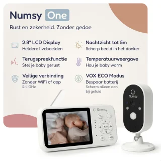 Houd je kleintje altijd in beeld en luister gerust mee — dag en nacht. De Numsy One 2.8 combineert heldere live-beelden, betrouwbare privacy en slimme, energiezuinige functies in één gebruiksvriendelijke babyfoon. Geen apps, geen wifi, geen gedoe — alleen directe rust voor jou en veilige controle over de babykamer.
