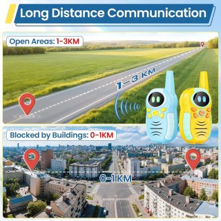 - Breed bereik (3–5 km): houdt kinderen met elkaar verbonden over grotere afstanden — perfect voor buitenspelen, kamperen en wandelingen.
